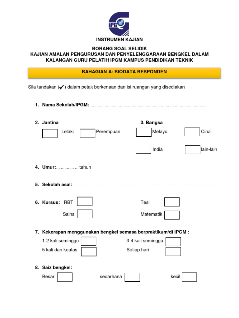 Iaitu kertas soalselidik dan ujian. Borang soal selidik atau temubual merupakan satu borang yang disediakan dengan pengisian beberapa soalan serta ruangan untuk responden menjawab soalan dan permaslahan yang ditanya. Sekarang semuanya lebih senang online. ( ) lelaki guru role model kepada murid demonstrasi/ tunjuk cara yang menarik memilih model yang ada tokoh, dipandang tinggi, cekap, baik. Borang soal selidik akan diedarkan kepada 30 orang penduduk taman jaya padang temu, melaka.