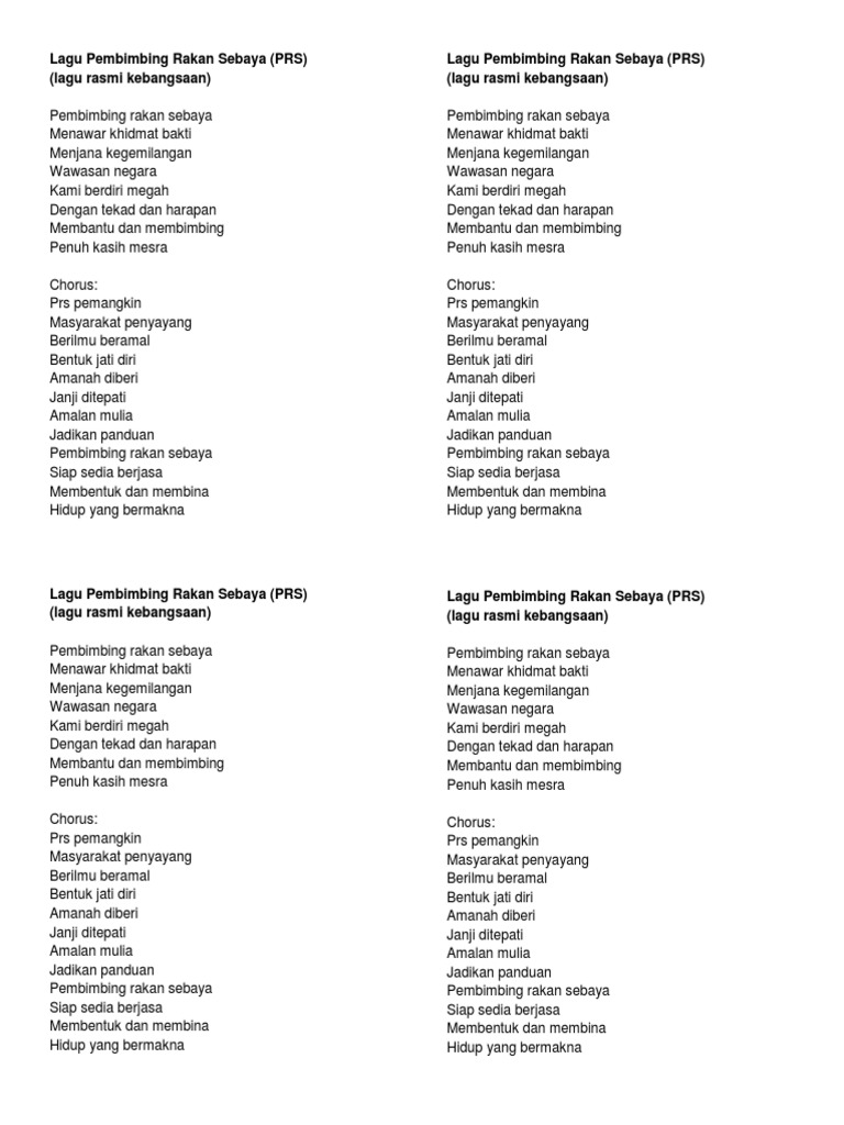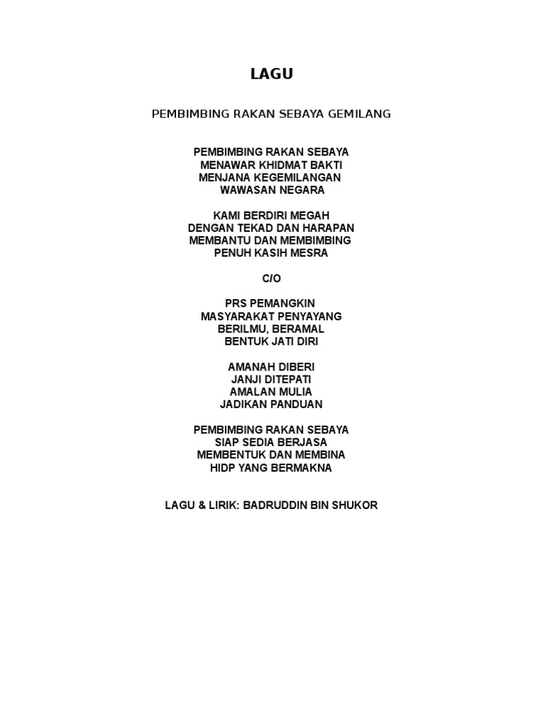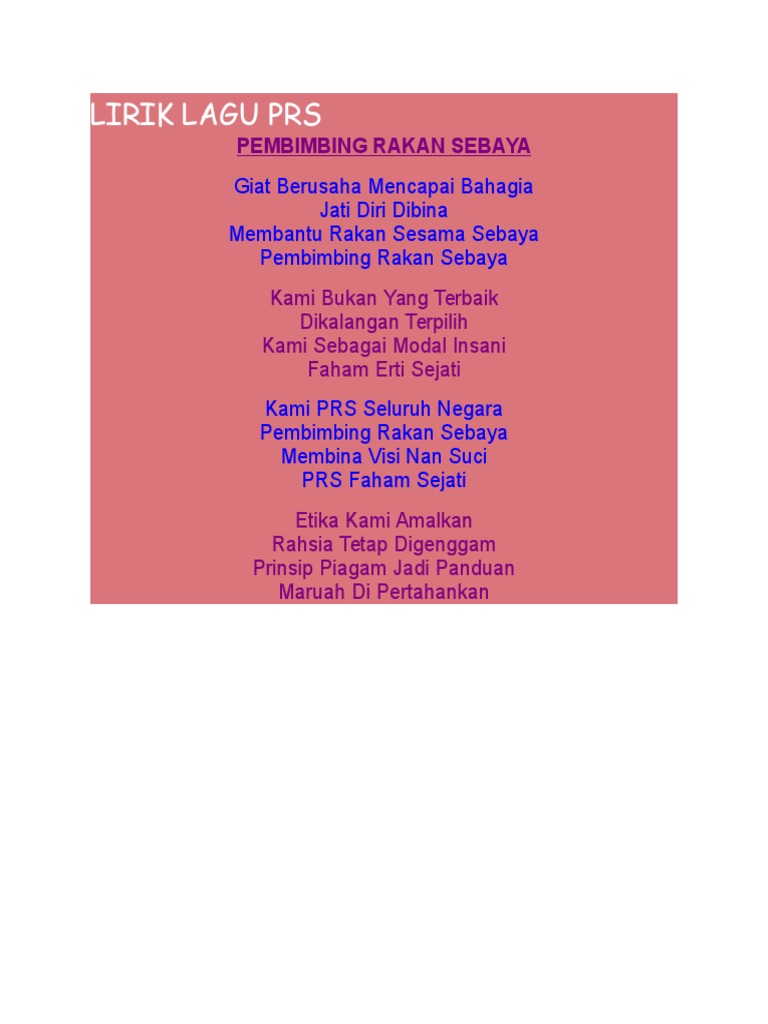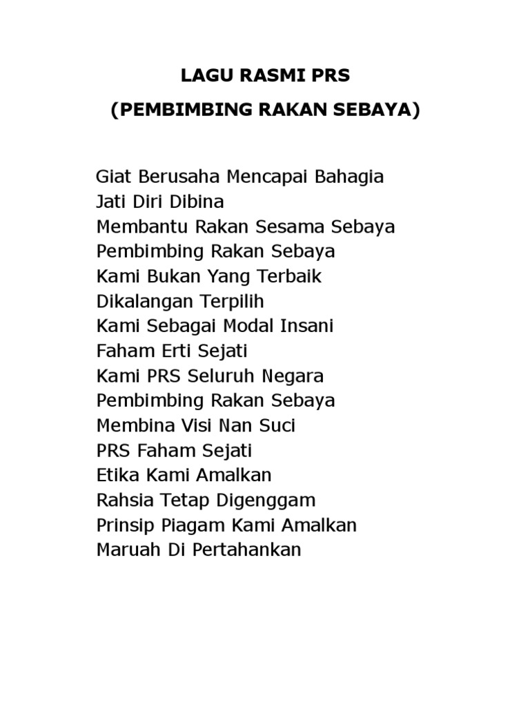 Lirik lagu pembimbing rakan serbaya (prs). Download mp3 sebaya gratis, ada 20 daftar lagu sebaya yang bisa anda download. This blog belongs to the pembimbing rakan sebaya(prs) of pusat tingkatan enam meragang(ptem). Lirik / sari kata lagu prs : Jumlah keseluruhan ahli prs adalah seramai 79 orang murid.
