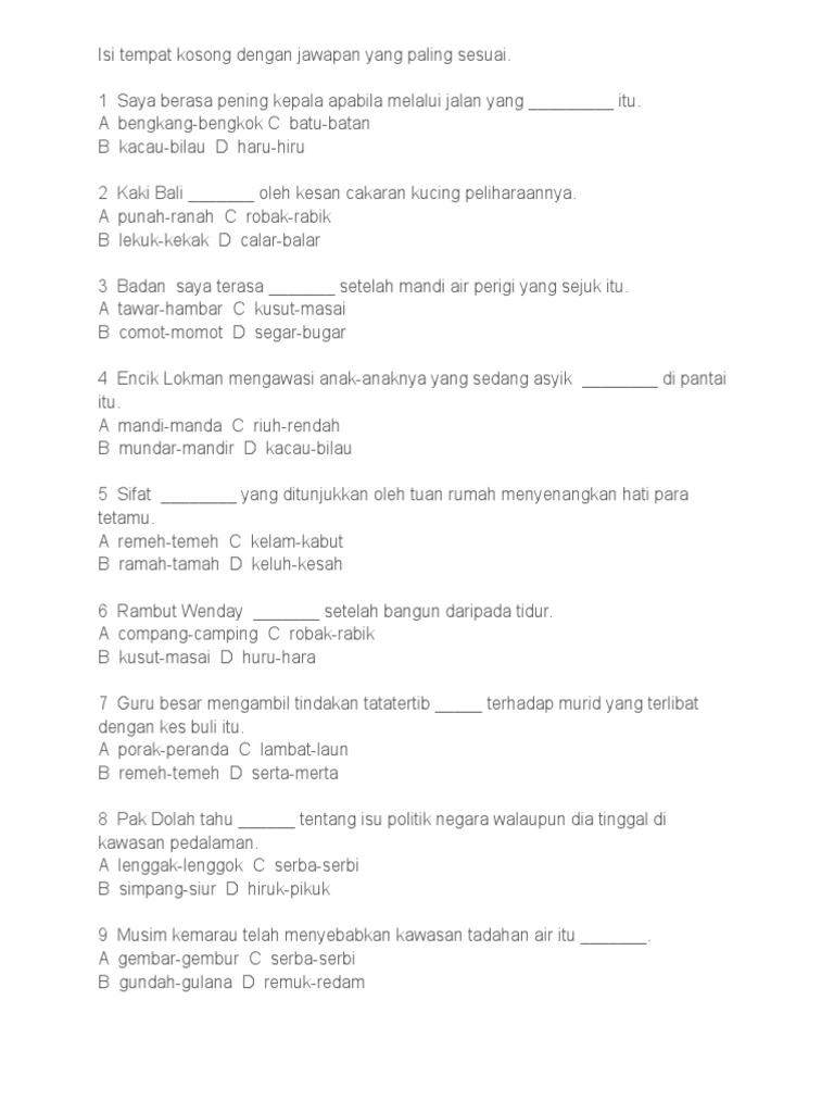Lembaran kerja mudah untuk topik kata ganda. Download & view latihan kata ganda berentak.docx as pdf for free. Latihan kata ganda separa jawab semua soalan. Jarak itu sebenarnya tak pernah ada. Latihan kata ganda berentak tahun 5. Bebalai,bebarau,bebawang,bebenang, bebola,bebotok,bebuli,bebuluh, cecair,cecawi,cecekak,dedali,dedalu, dedamak,dedaru,dedawai aslam, apakah kata ganda berentak / berima perkataan : Savesave latihan kata ganda berentak for later. Penggandaan berentak ialah proses yang menggandakan kata dasar. Kata ganda berentak terhasil daripada proses menggandakan kata dasar mengikut rentak bunyi tertentu pada kata dasar tersebut. Kata kata inspirasi motivasi hidup. Sesetengah kata ganda berentak telah sedia membawa makna sangat atau paling; Añadir a mis cuadernos (0) descargar archivo pdf insertar en mi. Download as docx, pdf, txt or read online from scribd.